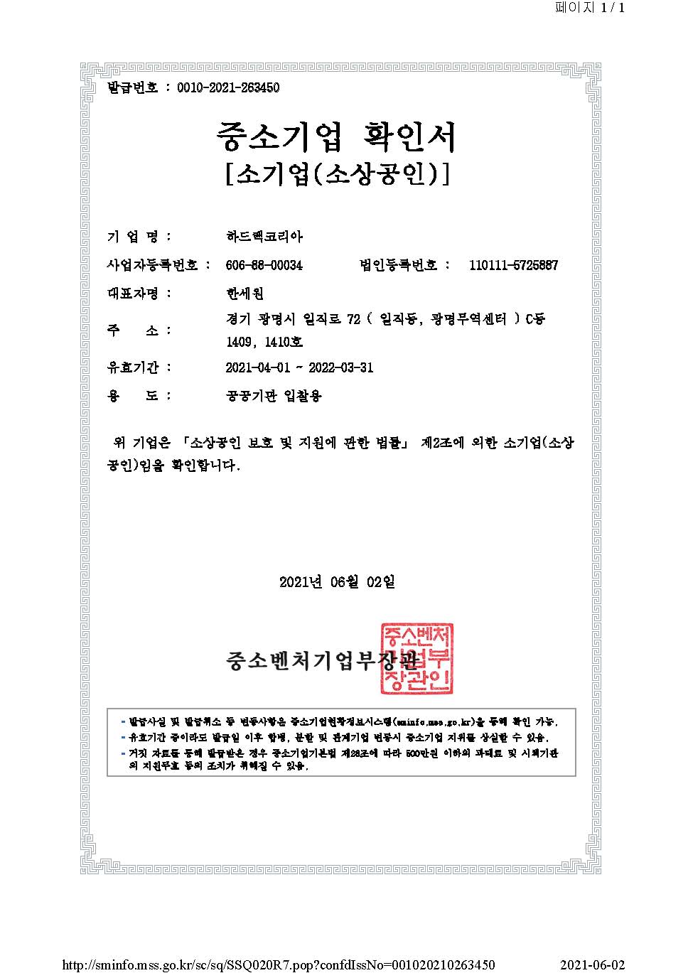 HOME > 회사소개 > 인증서 총 게시물 3건, 최근 0 건 중소기업 확인서 글쓴이 : 하드랙… 날짜 : 2021-06-17 (목) 17:34 조회 : 280 중소기업 인증서 이름 패스워드 비밀글 (체크하면 글쓴이만 내용을 확인할 수 있습니다.) 왼쪽의 글자를 입력하세요.
